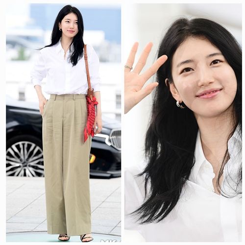 이날 수지는 밝고 깨끗한 흰 셔츠에 베이지톤 와이드 팬츠를 매치해 시원하면서도 단정한 공항 패션을 완성했다.