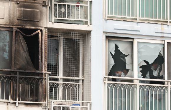 자매 참변 아파트 화재 현장 합동 감식 - 어린이 2명이 숨진 부산 기장군의 한 아파트 6층 화재 현장에서 3일 오전 경찰, 소방, 국립과학수사연구원 등이 합동 감식을 벌이고 있다. 부산 연합뉴스
