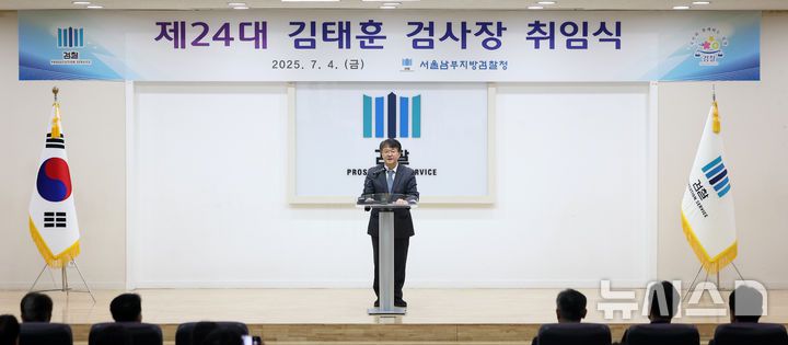 [서울=뉴시스] 김선웅 기자 = 김태훈 신임 서울남부지방검찰청 검사장이 4일 서울 양천구 서울남부지검에서 열린 제24대 검사장 취임식에서 취임사를 하고 있다. 2025.07.04. mangusta@newsis.com