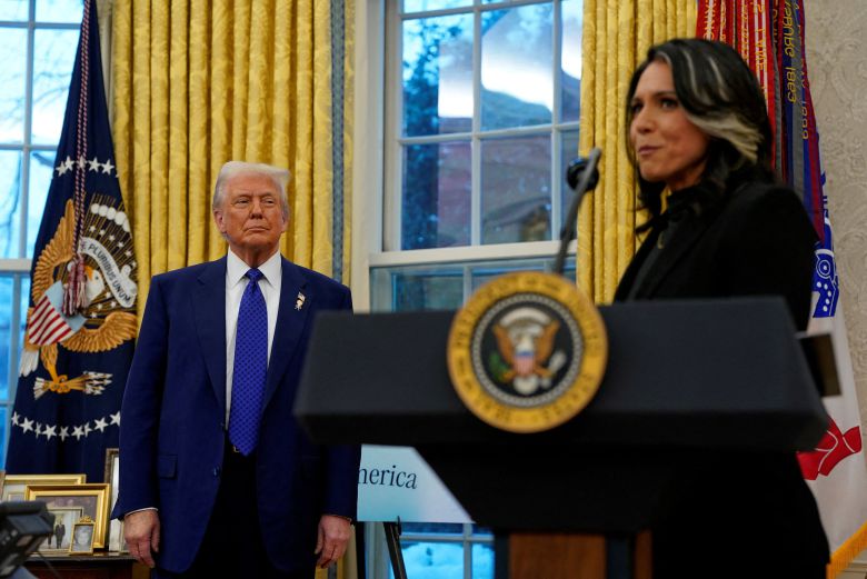 털시 개버드 미 국가정보국 국장(오른쪽)을 도널드 트럼프 대통령이 바라보고 있다. /로이터 연합뉴스 |