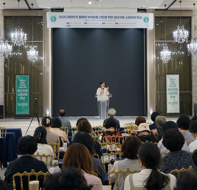 지난 3일 서울 서초구 더 리버사이드 호텔에서 열린 ‘소비자가 직접 뽑은 2025 대한민국 올해의 녹색상품(올녹상)’ 선정을 위한 투표에서 유미화 올녹상 소비자평가위원장이 소비자 투표단에게 소비자 투표 개요에 대해 설명하고 있다. 환경개선 효과가 우수한 상품을 발굴하고 녹색상품 시장을 확대하기 위해 제정된 ‘대한민국 올해의 녹색상품’은 한국녹색구매네트워크가 주관하는 소비자 참여형 제도로, 2008년부터 시작돼 올해로 16회째를 맞았다. 사진제공=한국녹색구매네트워크