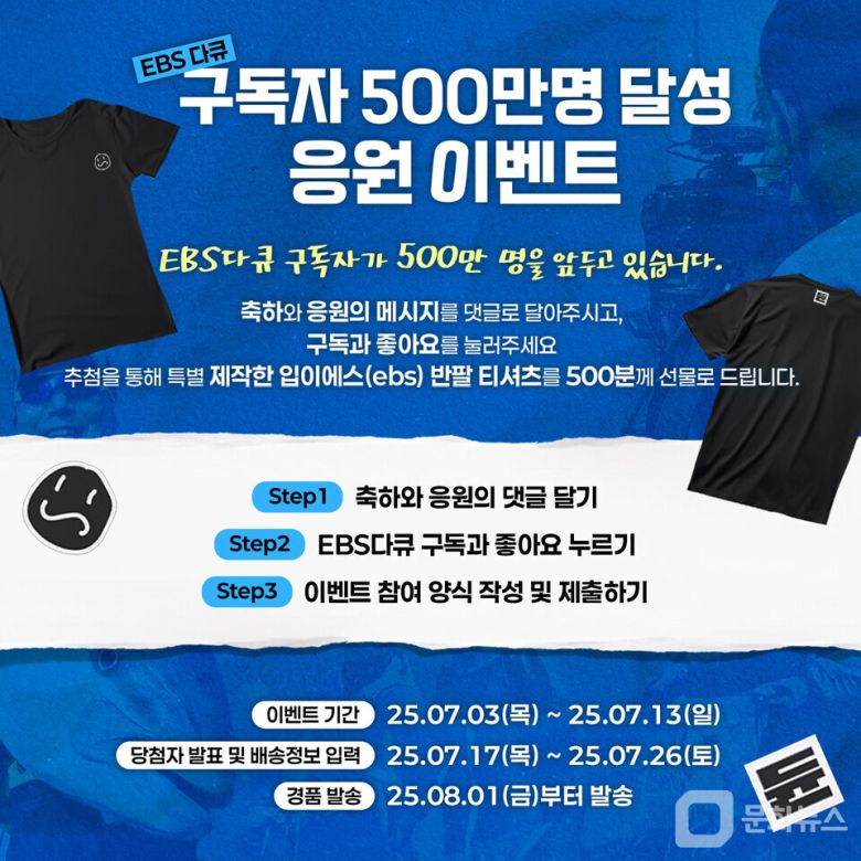 또한 EBS는 구독자 500만 명 달성을 앞두고 'EBS다큐' 채널에서 구독자 참여 이벤트를 진행 중이다. 참여자 중 500명을 선정하여 'EBS다큐'만의 감성을 담아 특별 제작한 반팔 티셔츠를 증정할 예정이다.