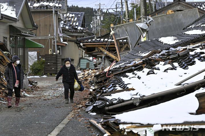 [스즈=AP/뉴시스]11일 일본 이시카와현 스즈시에서 사람들이 무너진 집 앞을 지나가고 있다. 2024.01.11.