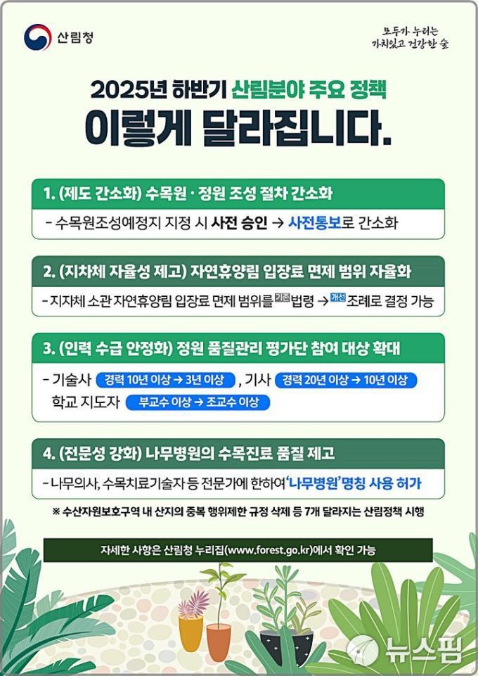 또한, 자연휴양림 입장료 면제 범위를 법령이 아닌 조례로 정할 수 있도록 개정할 예정이다. 정원 조성 사업이 증가함에 따라 '정원 품질평가단'의 자격 기준도 완화해 품질 평가 수요에 원활히 대응할 계획이다.