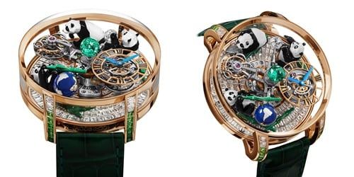 18K 로즈 골드 케이스에 판다 세 마리가 입체적으로 꾸며져 있으며, 중심부에는 지구처럼 회전하는 초록색 1캐럿 다이아몬드가 탑재돼 있다. 시계 전체에 총 9.28캐럿의 다이아몬드가 세팅됐으며, 가격은 약 96만 달러(한화 약 13억원)에 달한다.