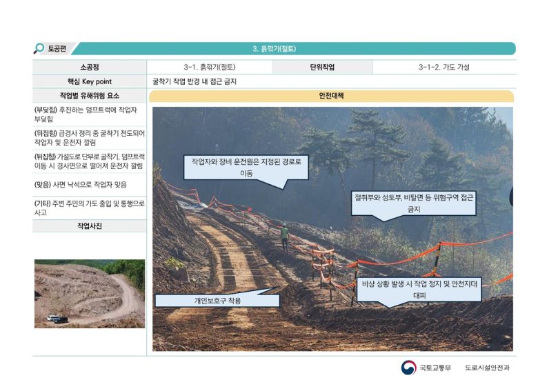 새 매뉴얼은 도로 공사 현장에서 이뤄지는 단위 작업별로 서술한 게 특징이다. 이전에는 건설기술진흥법, 산업안전보건법 등 제도 중심으로 내용을 구성해, 근로자 관점에서 이해와 숙지가 어렵다는 단점이 있었다.