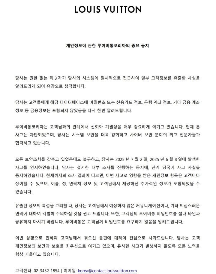 루이비통코리아 측은 "이번 사건으로 이름·성·연락처·고객이 제공한 기타 정보 등이 유출됐을 가능성이 있다"며 "다만 비밀번호나 신용카드·은행 계좌 등 민감한 금융정보는 포함되지 않았다"고 설명했다.