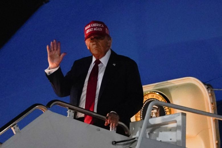 도널드 트럼프 미국 대통령이 4일(현지시간) 미국 아이오와주 시찰을 마치고 메릴랜드주 앤드루스 합동기지에서 공군1호기 착륙 후 손을 흔들고 있다. 로이터연합뉴스
