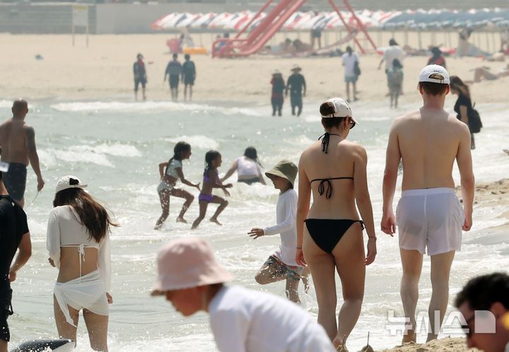 [서울=뉴시스] 류현주 기자 = 부산에 폭염경보가 발효 중인 4일 해운대해수욕장에 피서객들의 발길이 이어졌다.
