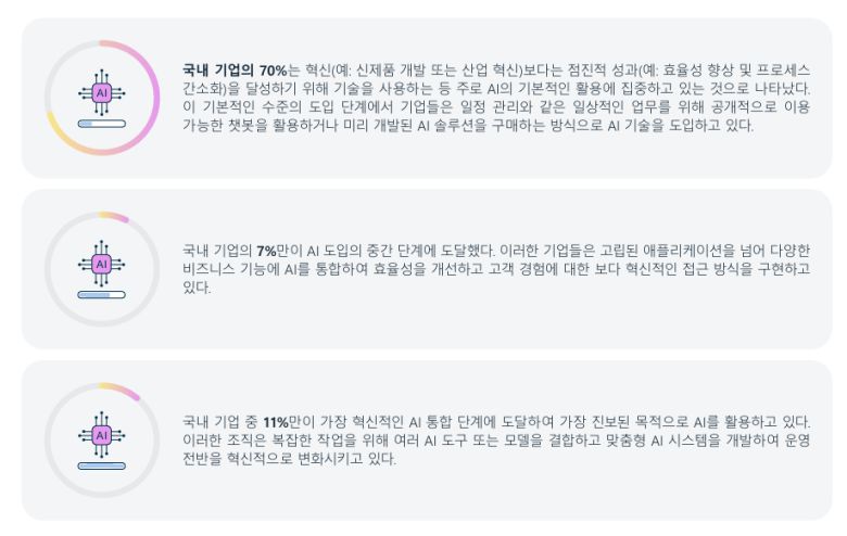 반면 대기업의 AI 활용은 아직 보수적인 수준에 머물러 있다. 대기업의 69%는 효율성 증대나 프로세스 간소화와 같은 점진적 이득을 얻기 위한 기본적인 수준의 AI 도입에 그치고 있다.