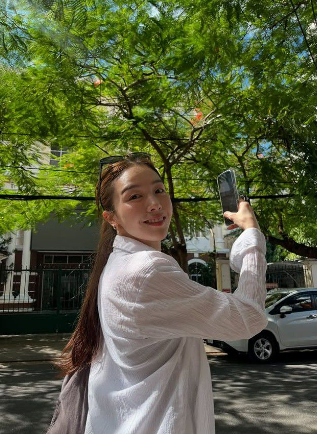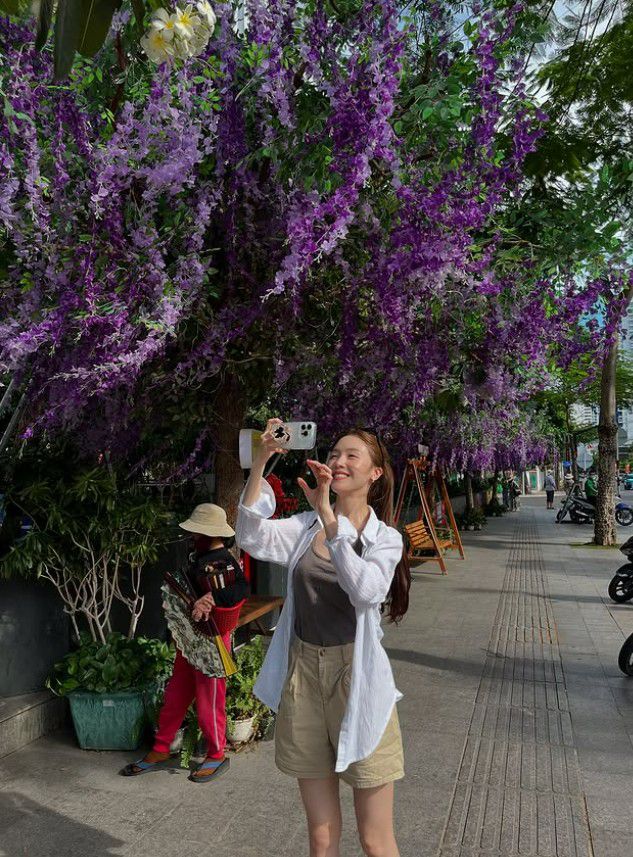 연보랏빛 꽃이 만개한 거리에서는 화이트 셔츠와 연베이지 팬츠를 매치한 내추럴 데일리룩으로 등장했다. 셔츠는 오픈해 그레이 슬리브리스 탑을 드러내고, 하이웨이스트 쇼츠로 비율을 살려 편안하면서도 단정한 인상을 줬다. 머리 위로 선글라스까지 올린 이 룩은 땀을 식히는 여름 산책길에도 딱 어울릴 만큼 청량한 매력을 담았다.