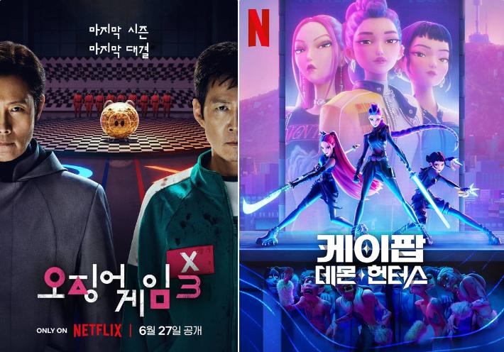 넷플릭스 오리지널 시리즈 '오징어 게임3'와 영화 '케이팝 데몬 헌터스' 포스터. 넷플릭스 제공 |