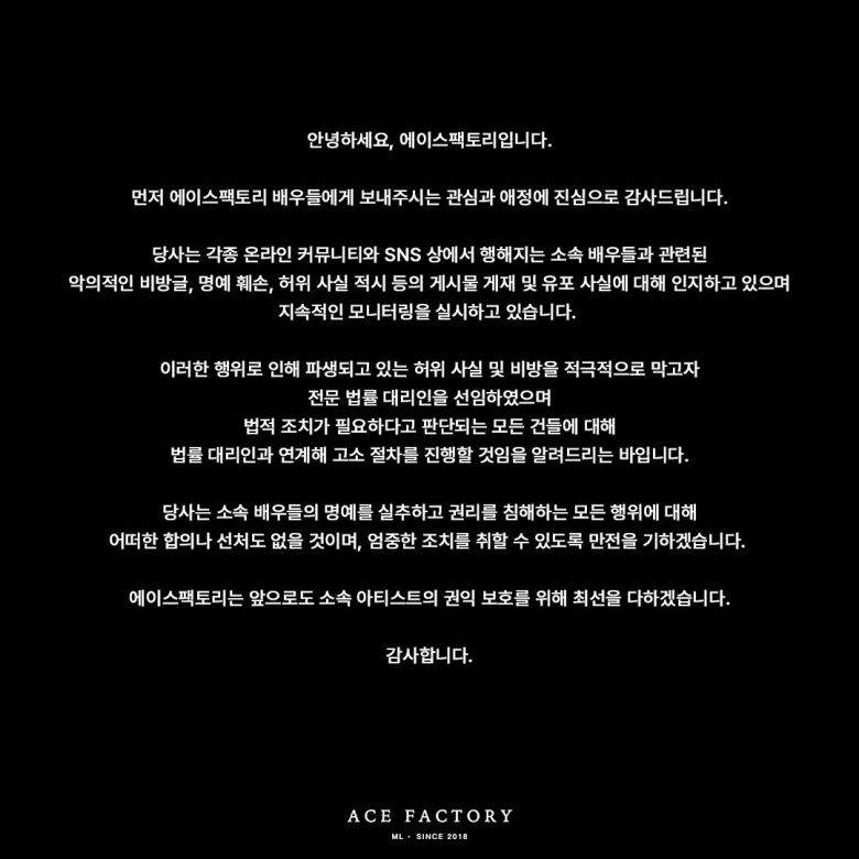 4일 에이스팩토리는 "당사는 각종 온라인 커뮤니티와 SNS 상에서 행해지는 소속 배우들과 관련된 악의적인 비방글, 명예 훼손, 허위 사실 적시 등의 게시물 게재 및 유포 사실에 대해 인지하고 있으며 지속적인 모니터링을 실시하고 있다"며 "법적 조치가 필요하다고 판단되는 모든 건들에 대해 법률 대리인과 연계해 고소 절차를 진행할 것임을 알려드린다"고 밝혔다.