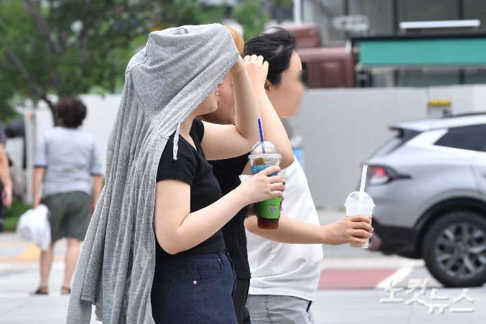 서울에 올해 첫 폭염주의보가 내려진 30일 오후 서울 종로구 광화문 광장에서 시민들이 옷으로 햇빛을 가리고 있다. 류영주 기자 |