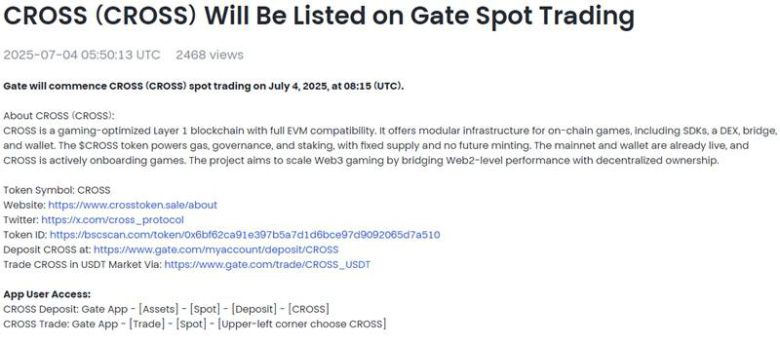 4일 오픈게임재단(Opengame Foundation)의 크로쓰($CROSS)가 글로벌 암호화폐 거래소 게이트아이오(Gate.io)에 추가 상장된다.