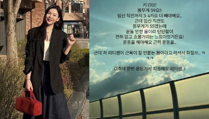 키가 170cm에 몸무게 59kg이라는 이다은은 "임신 직전까지 3-4kg 더 빼야 한다. 근데 임신 직전도 몸무게가 55kg이었는데 운동 안 한 몸이라 탄탄함이 전혀 없고 흐물거리는 느낌이었다"고 했다.
