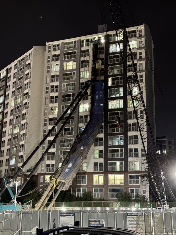 [용인=뉴스핌] 류기찬 인턴기자 = 5일 오후 경기 용인시 기흥구 서천동 인덕원~동탄 복선전철 공사 현장에서 대형 중장비인 '천공기'(지반을 뚫는 건설기계)가 인근 아파트를 덮치는 사고가 발생했다. 사진은 사고현장의 모습. 2025.06.05 ryuchan0925@newspim.com