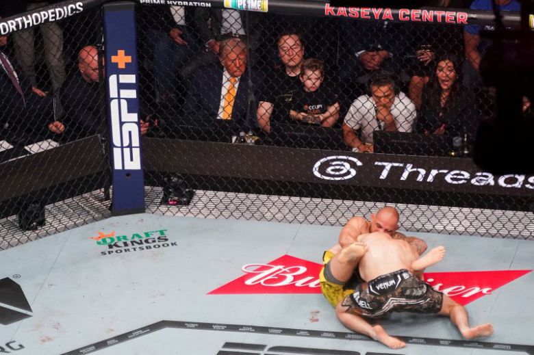 지난 4월 12일 미국 플로리다주 마이애미의 케이세야 센터에서 노란 넥타이를 맨 도널드 트럼프 미국 대통령이 UFC 경기를 관람하고 있다.로이터연합뉴스