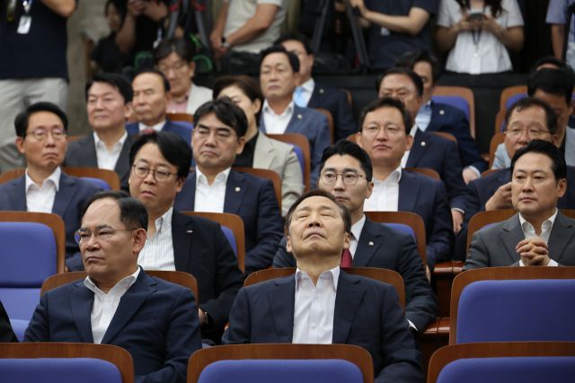 ▲4일 서울 여의도 국회에서 열린 국민의힘 의원총회에서 의원들이 송언석 비상대책위원장 겸 원내대표의 발언을 듣고 있다. ⓒ연합뉴스