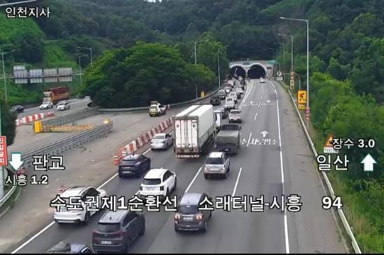 4일 시흥시는 안전재난문자를 통해 "이날 오후 4시 37분 수도권제1순환고속도로 일산 방향 소래터널에서 화재 발생으로 전면통제 중"이라며 "인근 도로로 우회 바란다"고 밝혔다.