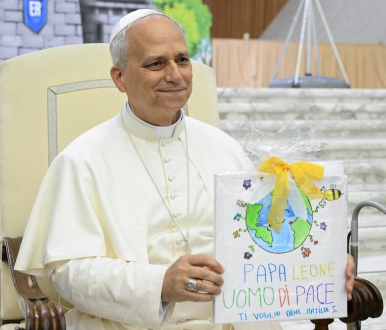 교황 레오14세가 3일(현지시각) 바티칸 시국 바오로 6세홀에서 열린 여름캠프에 참가하는 어린이와 젊은이들과 함께 지구가 그려진 그림을 들고 있다. 바티칸/EPA 연합뉴스 |