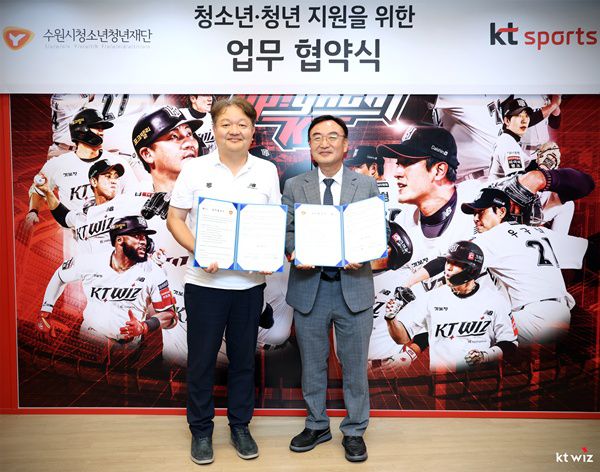 업무 협약식에는 강신혁 kt sports 마케팅 센터장과 최종진 수원시청소년청년재단 이사장이 참석했다.