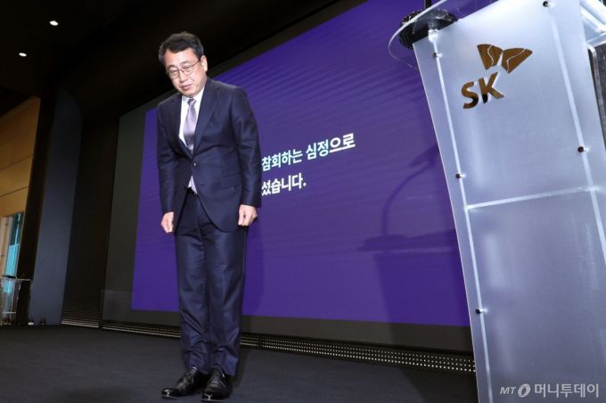 유영상 SK텔레콤 대표이사가 4일 서울 중구 SKT타워에서 열린 해킹 사태 관련 입장 및 향후 계획 발표 기자회견에서 고개 숙여 사과하고 있다. /사진=뉴스1 /사진=(서울=뉴스1) 박지혜 기자