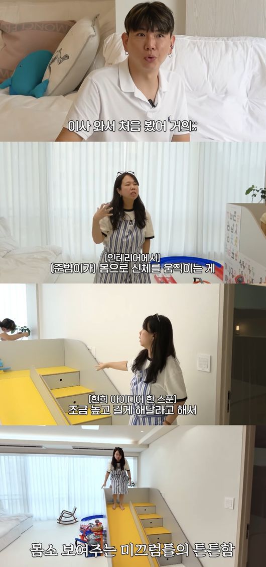 특히 홍현희는 직접 제작한 특별한 미끄럼틀을 공개해 눈길을 끌었다. 그는 “(인테리어에서) 제가 이번에 (준볌이가) 몸으로 신체를 움직이는 게 가장 중요하다고 생각하다가 미끄럼틀을 제작해주셨다”라고 설명했다.