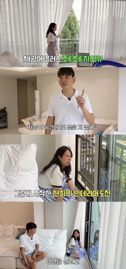 환한 채광에 반해 바로 계약했다는 홍현희는 “해가 너무 잘들어서 보자마자 여기로 (했다)”라며 “초록이 많다. 준범이 딱 일어나서 초록색 보고 맑은 날에는 파란색 보니까 너무 좋아한다”라며 자연뷰를 자랑했다.