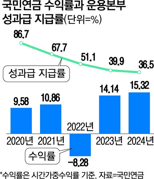 국민연금기금운용위원회가 2024년도 성과급 지급률을 기본급 대비 36.5%로 의결했다. 지난해 국민연금이 역대 최고 수익률을 기록했으나 기준 수익률을 하회해 오히려 성과급은 전년 대비 줄었다.