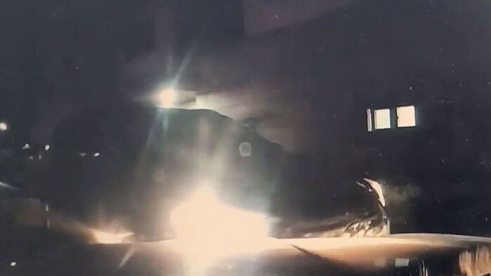 비좁은 도로에서 SUV 차량이 갑자기 방향을 바꾸며 달립니다.