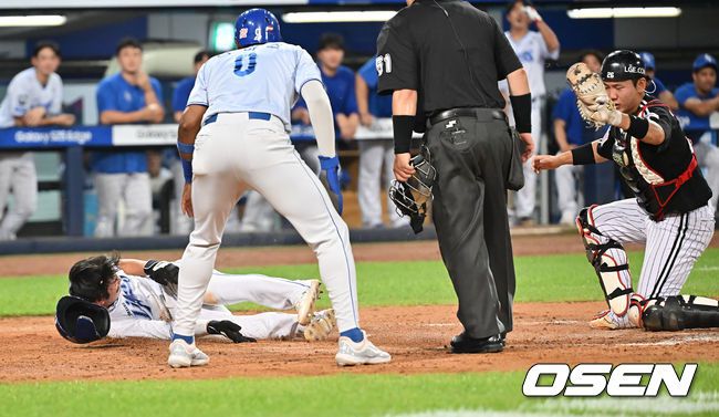 삼성 라이온즈 김영웅이 7회말 2사 1,2루 이재현의 좌중간 2루타때 홈 쇄도하다 부상을 당하고 있다. 2025.07.04 / foto0307@osen.co.kr