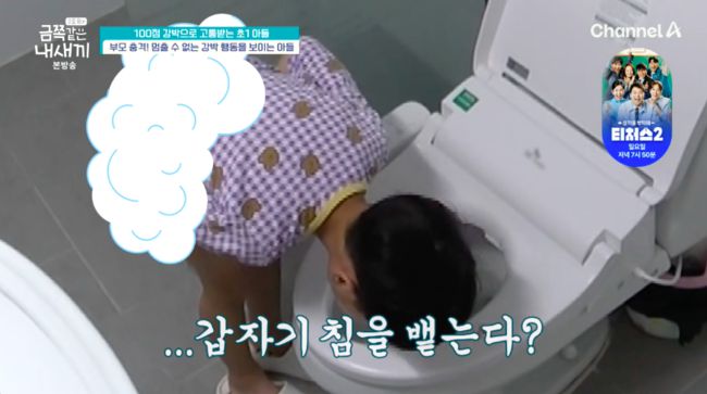 볼일을 마친 뒤에는 갑자기 침을 뱉기 시작해 모두를 충격에 빠트렸다. 엄마는 “침을 뱉는 행동도 최근에 나왔다. 밖에서도 침을 뱉는다고 하더라”라고 전했다. 이에 신애라는 “이것도 오염 강박이냐”라고 물었고, 오은영 박사는 “강박적인 면이 있다”라고 답했다.