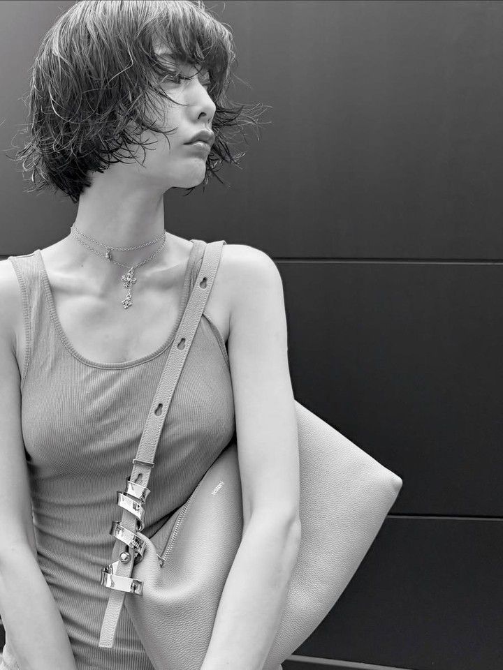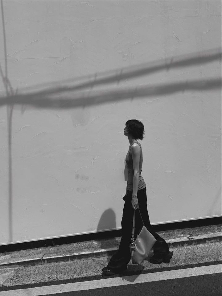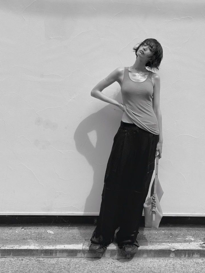 어깨선이 드러나는 슬리브리스 톱에 실버 컬러의 레이어드 초커와 펜던트 목걸이, 그리고 한쪽 어깨로 멘 가죽 숄더백으로 시크하면서도 감각적인 여름 스타일링을 완성했다.