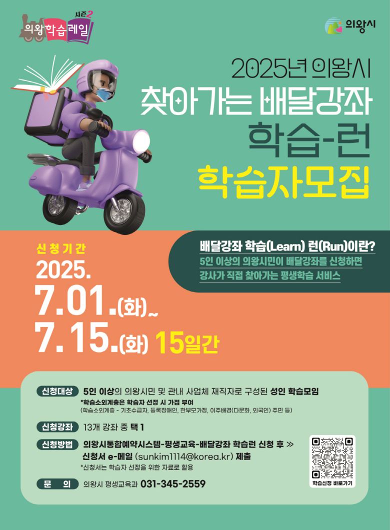 의왕시는 사각지대 없는 평생학습 문화 확산을 위해 시민이 원하는 시간과 장소에서 평생학습 강좌를 수강할 수 있는 배달 강좌 '학습-런'의 참여자를 모집한다.