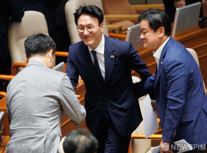 [서울=뉴스핌] 윤창빈 기자 = 김민석 국무총리가 4일 오후 서울 여의도 국회에서 열린 본회의를 마치고 나서며 의원들과 인사를 나누고 있다. 2025.07.04 pangbin@newspim.com