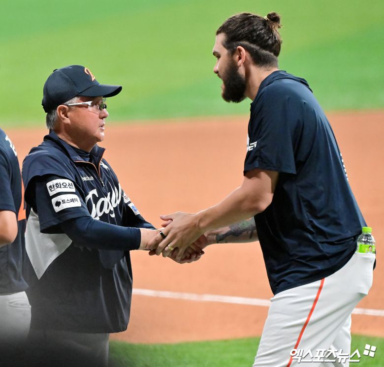 경기 후 김경문 감독은 "폰세가 정말 훌륭한 피칭을 보여줬는데 승리로 이어지지 못해 미안한 마음이다"라며 "팀으로서는 노시환의 귀중한 홈런으로 승리를 거둘 수 있었다"고 우여곡절 끝의 승리에 박수를 보냈다.