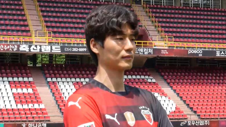 같은 빨간색이지만, 익숙하던 서울이 아닌 포항 엠블럼이 새겨진 유니폼을 입은 기성용.