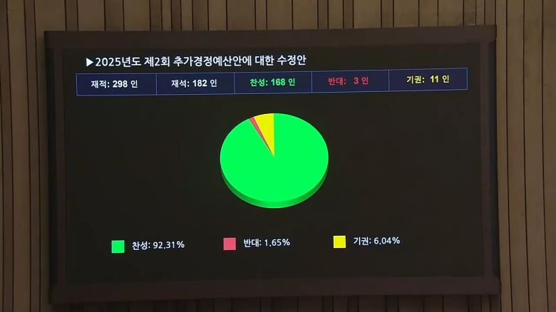 국회는 오늘(4일) 밤 본회의를 열고 정부 제출안보다 1조 3천억원가량 늘어난 31조 8천억원 규모의 추경안을 재석 의원 182명 중 찬성 168명으로 가결했습니다.