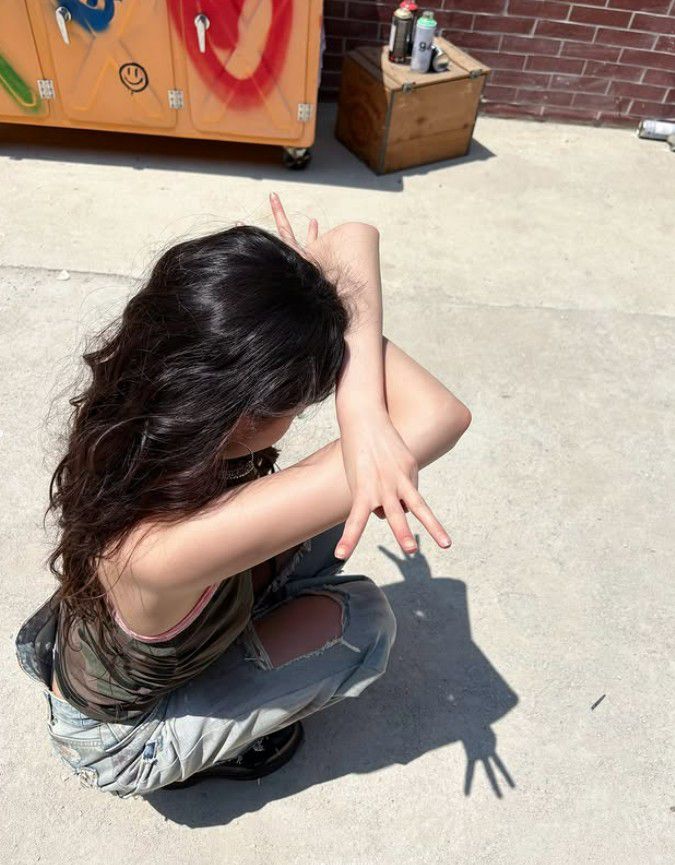 팔꿈치를 이마까지 올린 뒤 손을 교차시켜 손가락 세 개를 펼친 자세로 고양이 그림자를 만드는 유행에도 빠지지 않는다. 밀리터리 무늬의 민소매 탑과 찢어진 연청 데님을 착용해 스트릿 패션을 선보였다.