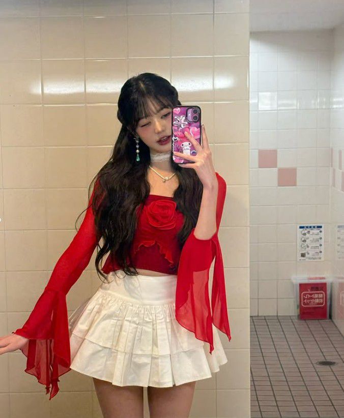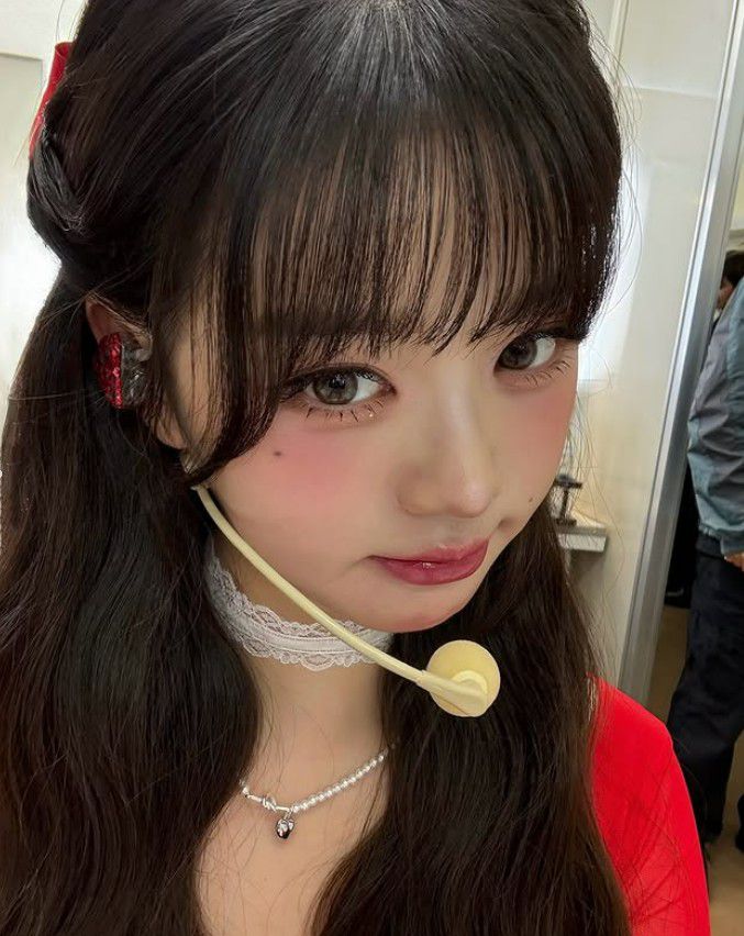공개된 사진 속 장원영은 레드 컬러의 플라워 장식 시스루 톱과 화이트 플리츠 스커트를 매치해 완성도 높은 무대 스타일링을 자랑했다. 붉은 장미를 연상시키는 상의 디테일이 돋보이며, 헤어밴드와 이어 모니터까지 톤을 맞춘 스타일링으로 무대의상을 완벽히 소화했다.