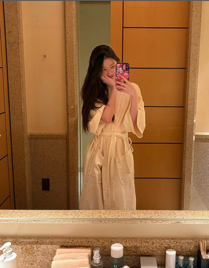반면, 꾸밈 없는 일상 속 장원영의 모습도 시선을 끌었다. 내추럴한 베이지 컬러의 가운을 입고 호텔 욕실 거울 앞에서 찍은 셀카는 무대의 화려함을 벗은 '스무 살 장원영'의 맑고 담백한 얼굴을 담아낸다.