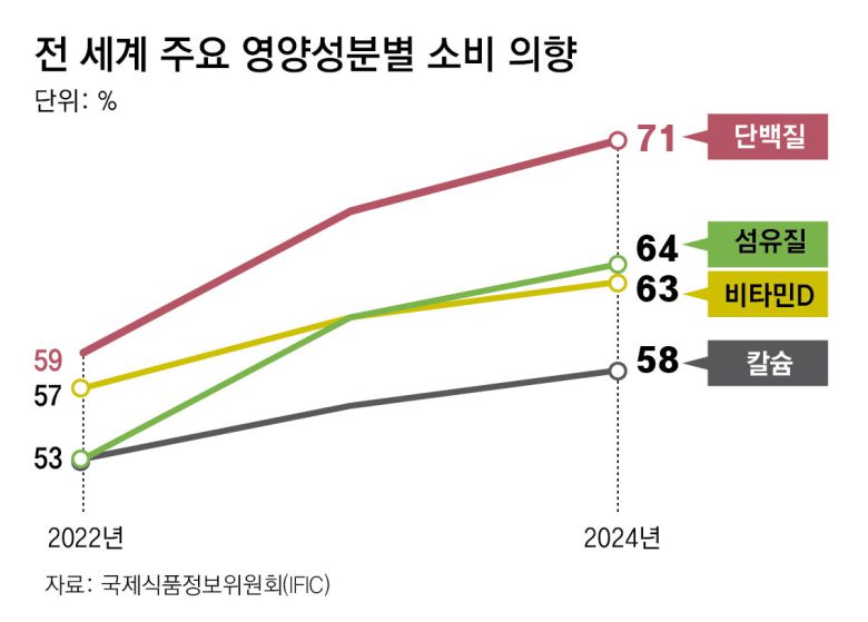 소비자들의 식품 선택 기준이 까다로워진 것도 단백질 식품 시장 성장에 한몫을 하고 있다. 음식을 섭취할 때 단백질, 섬유질, 비타민D 등 영양성분을 꼼꼼히 따져보는 소비자가 늘고 있는 것이다. 국제식품정보위원회(IFIC)에 따르면 지난해 가장 선호하는 영양소로 단백질이 1위를 차지했다. 단백질 소비 의향은 2022년 이후 연평균 9.7% 증가세를 나타내고 있다. ‘맛있게 건강을 챙기자’는 ‘헬시플레저(Healthy+Pleasure)’ 유행이 확산된 것도 맛과 영양을 동시에 겨냥한 단백질 식품이 시장에 쏟아지고 있는 배경이다.