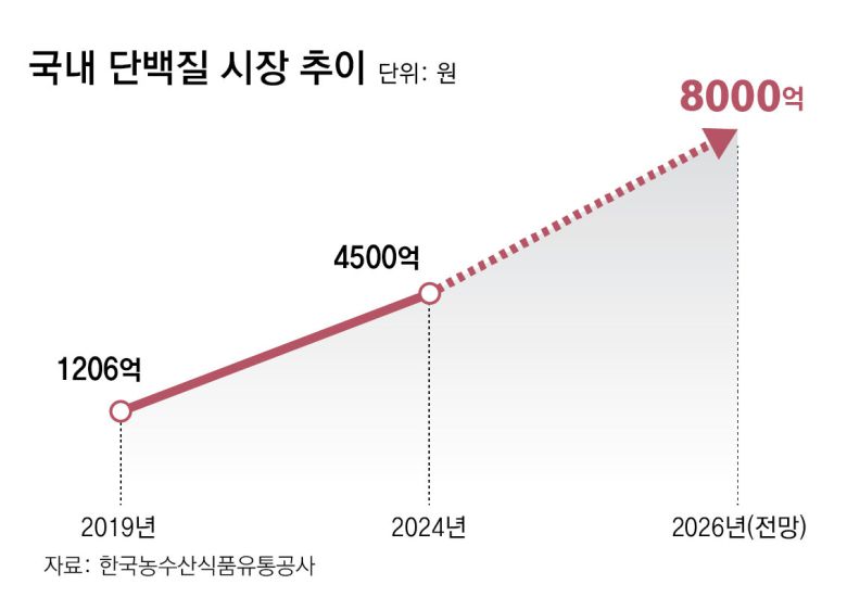 한국농수산식품유통공사(aT)에 따르면 국내 단백질 시장은 2019년 1206억 원에서 2024년 4500억 원으로 약 4배로 성장했다. 2026년에는 이보다 77.8% 증가한 8000억 원에 이를 것으로 전망된다. 시장조사업체 그랜드뷰리서치는 글로벌 단백질 원료 시장도 2022년 776억9000만 달러(약 105조5263억 원)에서 2030년 1221억7000만 달러(약 165조9435억 원)로 연평균 5.8%씩 성장할 것으로 내다봤다.