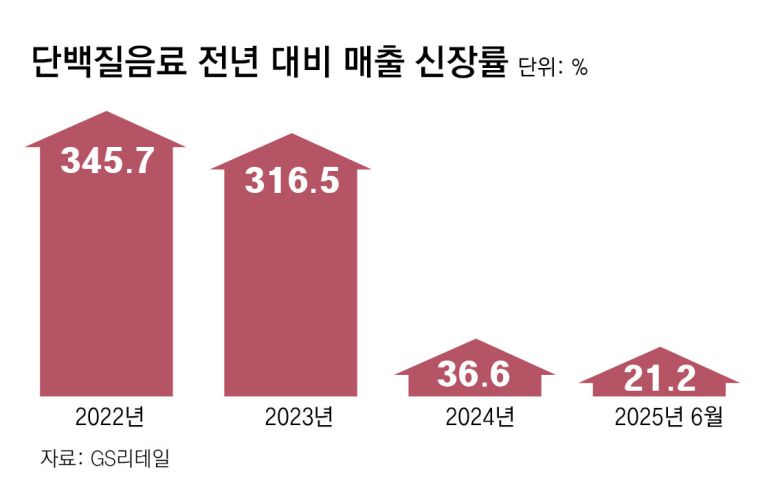 실제 판매 데이터에서도 단백질 음료의 인기를 확인할 수 있다. GS리테일에 따르면 단백질 음료의 전년 대비 매출 신장률은 2022년 345.7%, 2023년 316.5%에 달했고, 2024년에는 36.6%, 2025년 상반기(1∼6월)에도 21.2% 성장세를 이어가고 있다. 올해 들어서는 전체 우유 카테고리 매출 중 단백질 음료 매출 비중이 15.4%로 처음으로 10%를 넘었다. 2020년만 해도 10여 종에 불과하던 단백질 음료 제품 수는 2024년 현재 60여 종으로 늘어날 만큼 경쟁도 치열해지고 있다.