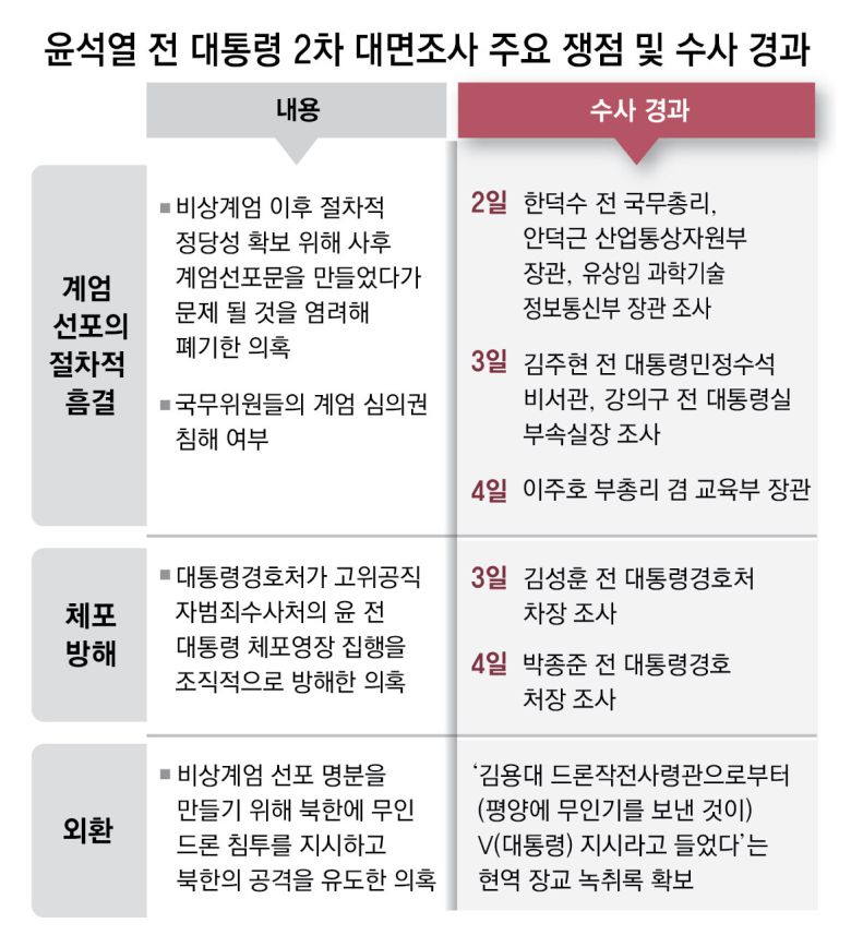 특검은 1차 조사 이후 한 전 총리, 김 전 수석, 이 부총리 등 핵심 관계자들에 대한 조사는 물론이고 외환 혐의 관련 군 관계자 다수도 이미 조사를 마치며 혐의를 더욱 다져 놓은 상태다. 박 특검보는 “외환 관련 부분에 대해선 상당수 조사가 이뤄지고 있다”고 말했다. 한 검찰 출신 변호사는 “특검이 1차 조사 이후 윤 전 대통령 측의 심리를 압박하는 측면에서도 다양한 관계자들을 조사했을 것”이라며 “윤 전 대통령 수사 외적으로도 변호인들에 대한 수사까지 하며 압박을 하고 있다”고 설명했다.