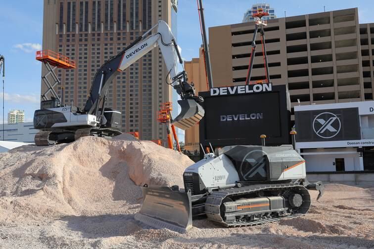 운전석이 없는 디벨론(DEVELON) 굴착기와 도저(dozer)./HD현대인프라코어 제공 |
