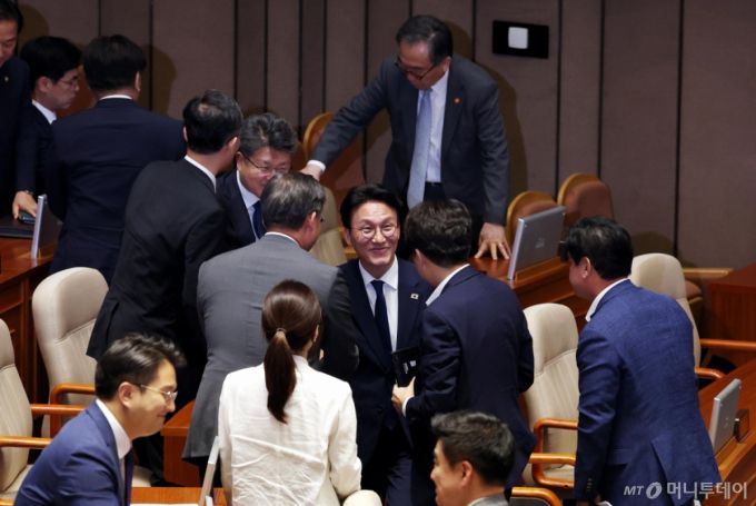 [서울=뉴시스] 조성봉 기자 = 김민석 국무총리가 4일 오후 서울 여의도 국회에서 열린 제426회 국회(임시회) 제5차 본회의를 마치고 의원들과 악수를 하고 있다. 이날 제2회 추가경정예산안은 재석 182인, 찬성 168인, 반대 3인, 기권 11인으로 가결됐다. 2025.07.04. suncho21@newsis.com /사진=조성봉 |
