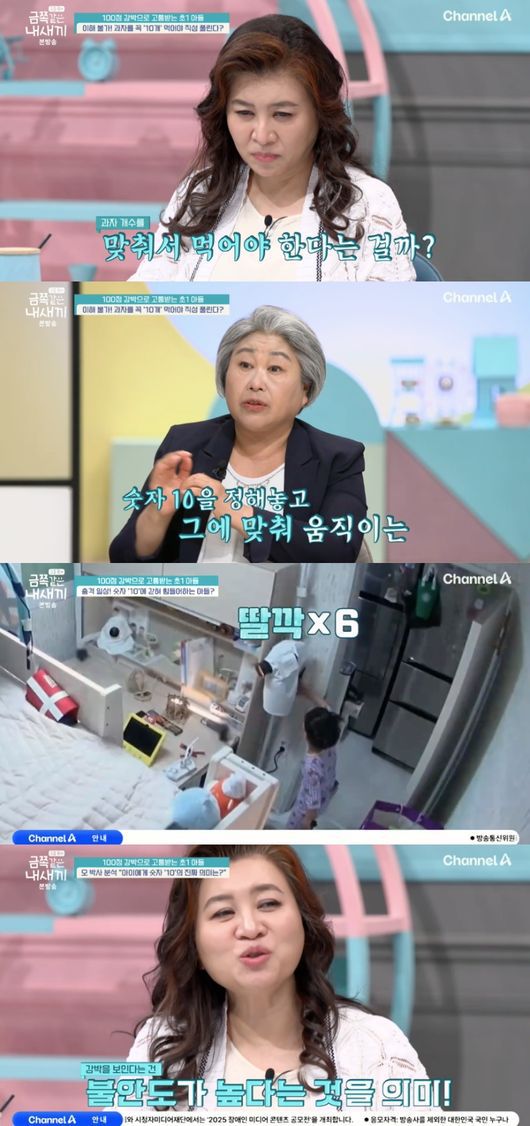 이날 금쪽이는 ‘무조건 100점을 맞아야 한다’는 점수 집착에 이어 숫자 강박을 보였다. 한자 공부 시작과 동시에 과자 2개를 먹던 금쪽이는 엄마의 제지에 “과자 10개 먹어야 한다. 8개 더 먹어야 한다. 8개만, 제발. 아니면 이따가 10개 더 먹어야 한다”라고 말했다.