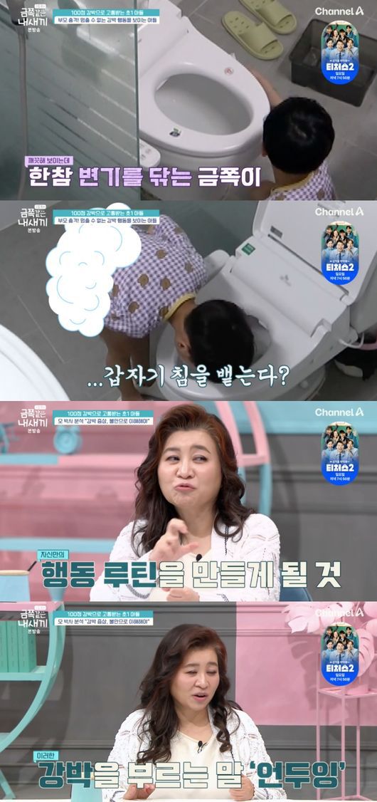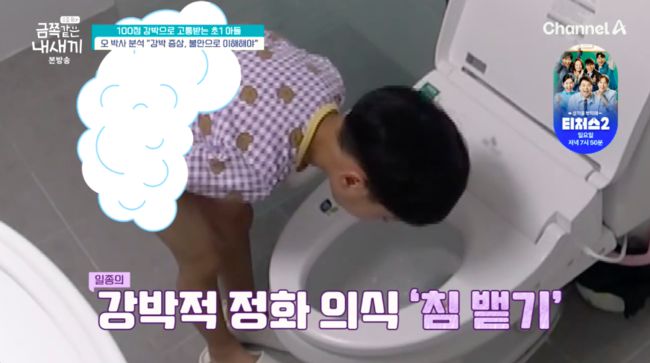 특히 금쪽이는 볼일을 마치고 갑자기 변기에 침을 뱉기 시작해 모두를 놀라게 했다. 엄마는 “침을 뱉는 행동도 최근에 나왔다. 밖에서도 침을 뱉는다고 하더라”라고 했고, 신애라는 “이것도 오염 강박이냐”라고 물었다.